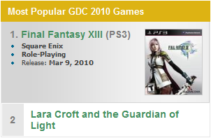 O site GameSpot está a fazer a sua cobertura sobre a Game Developers Convention onde Lara Croft and the Guardian of Light terá a sua apresentação (ou já teve), e de acordo com seu site, o jogo está em 2° lugar dos jogos mais populares da convenção!